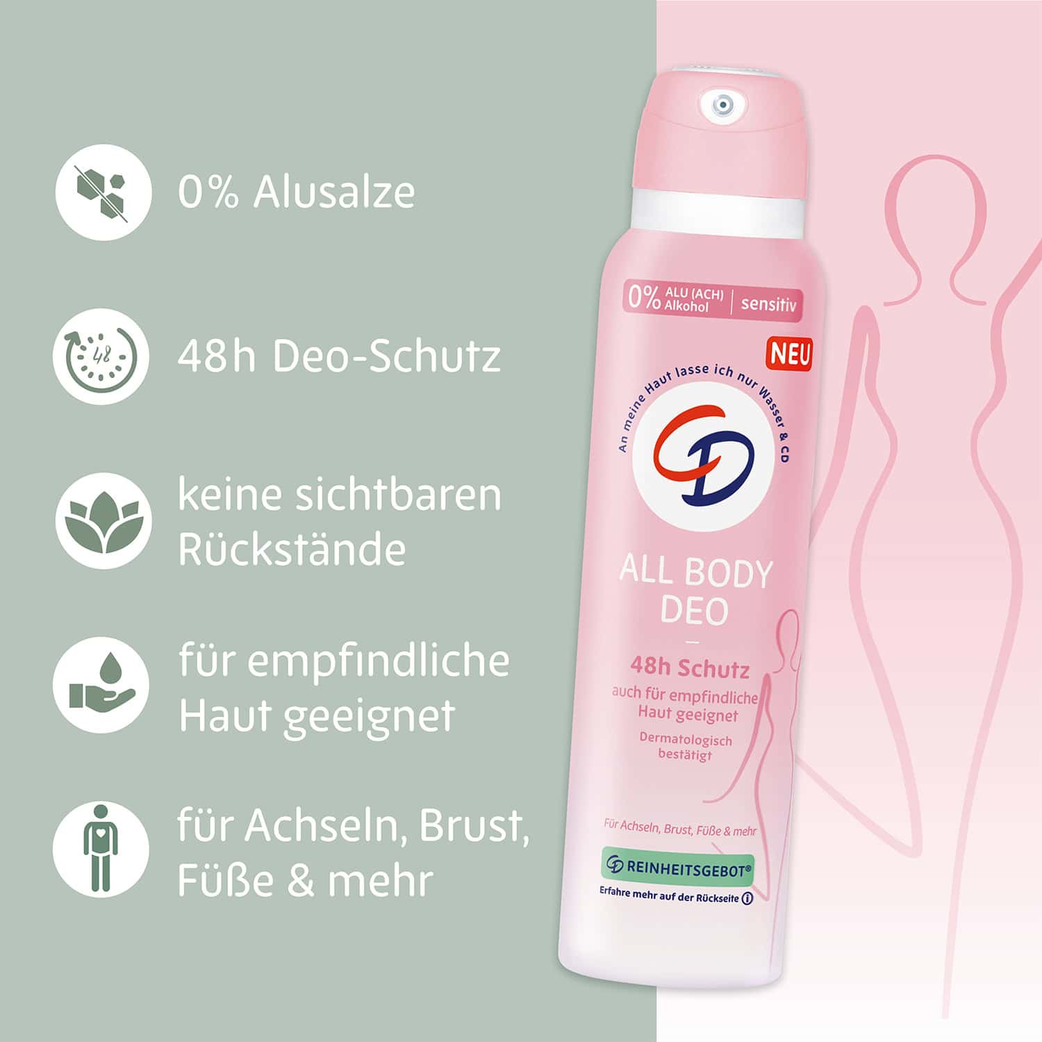 Das All Body Deo-Spray eignet sich ideal für alle Körperzonen wie Achseln, Brust, Beine oder Füße. Dank seiner leichten Textur und Sprühformel verteilt es sich gleichmäßig und zieht sofort ein.