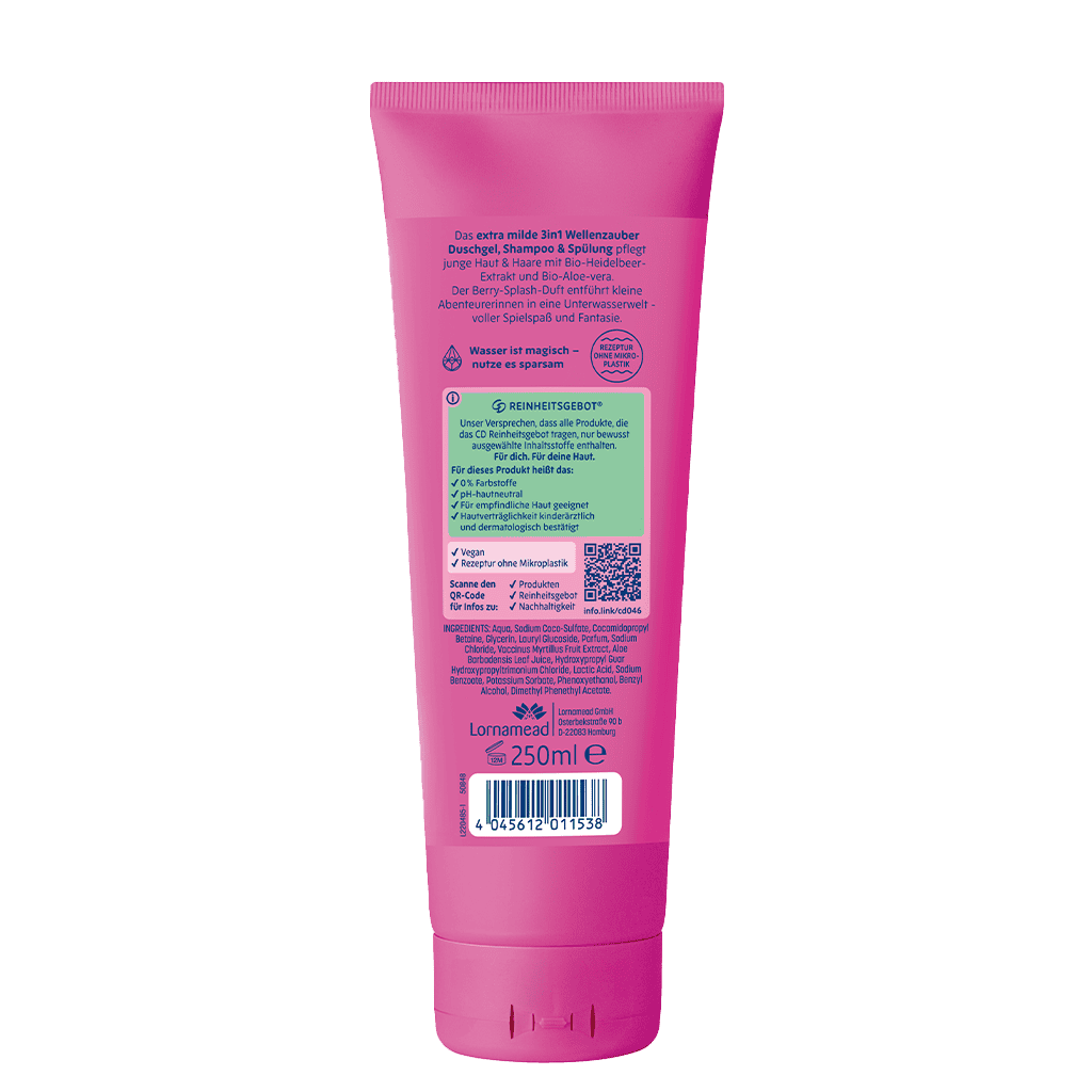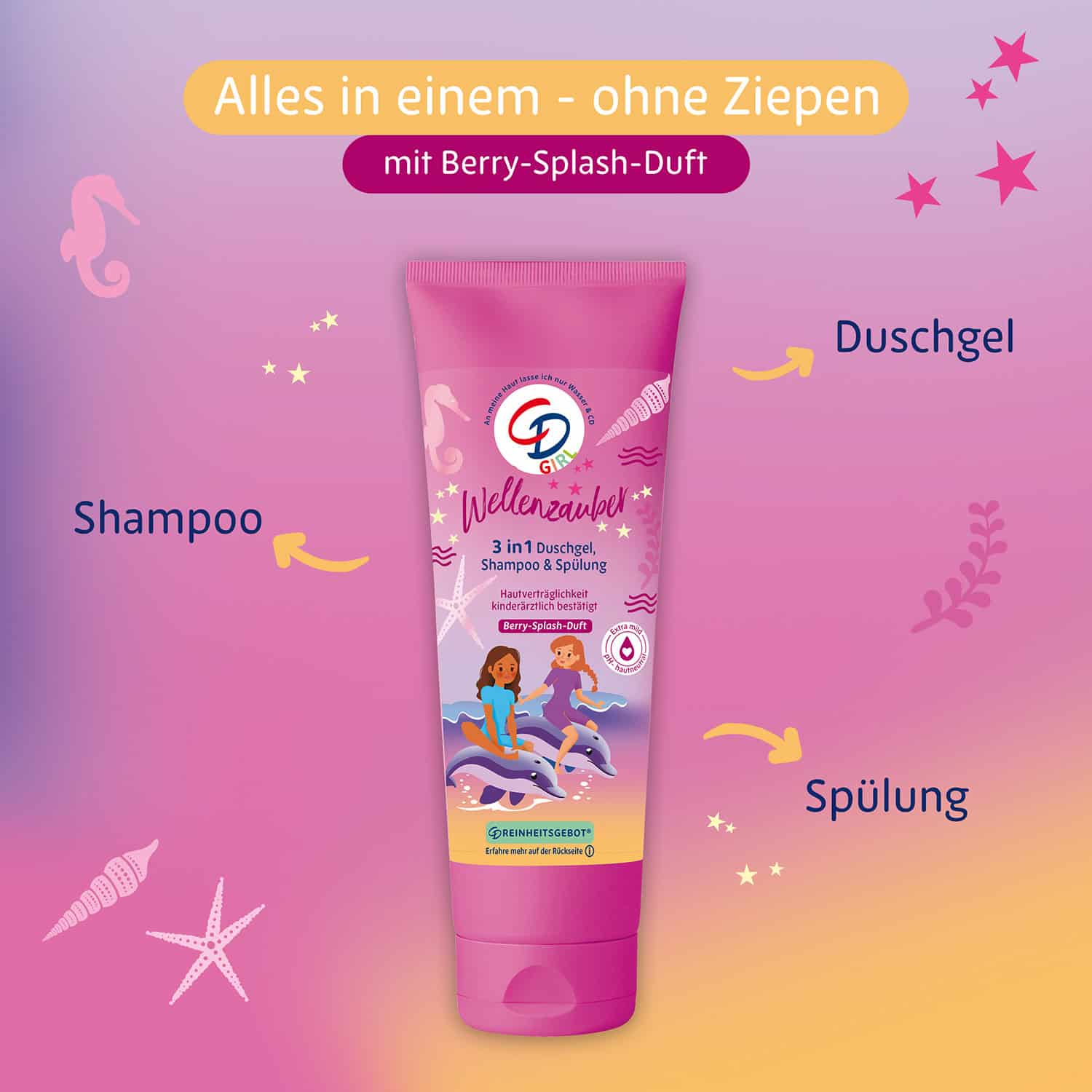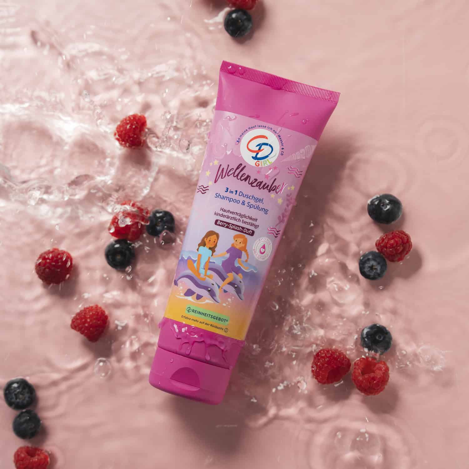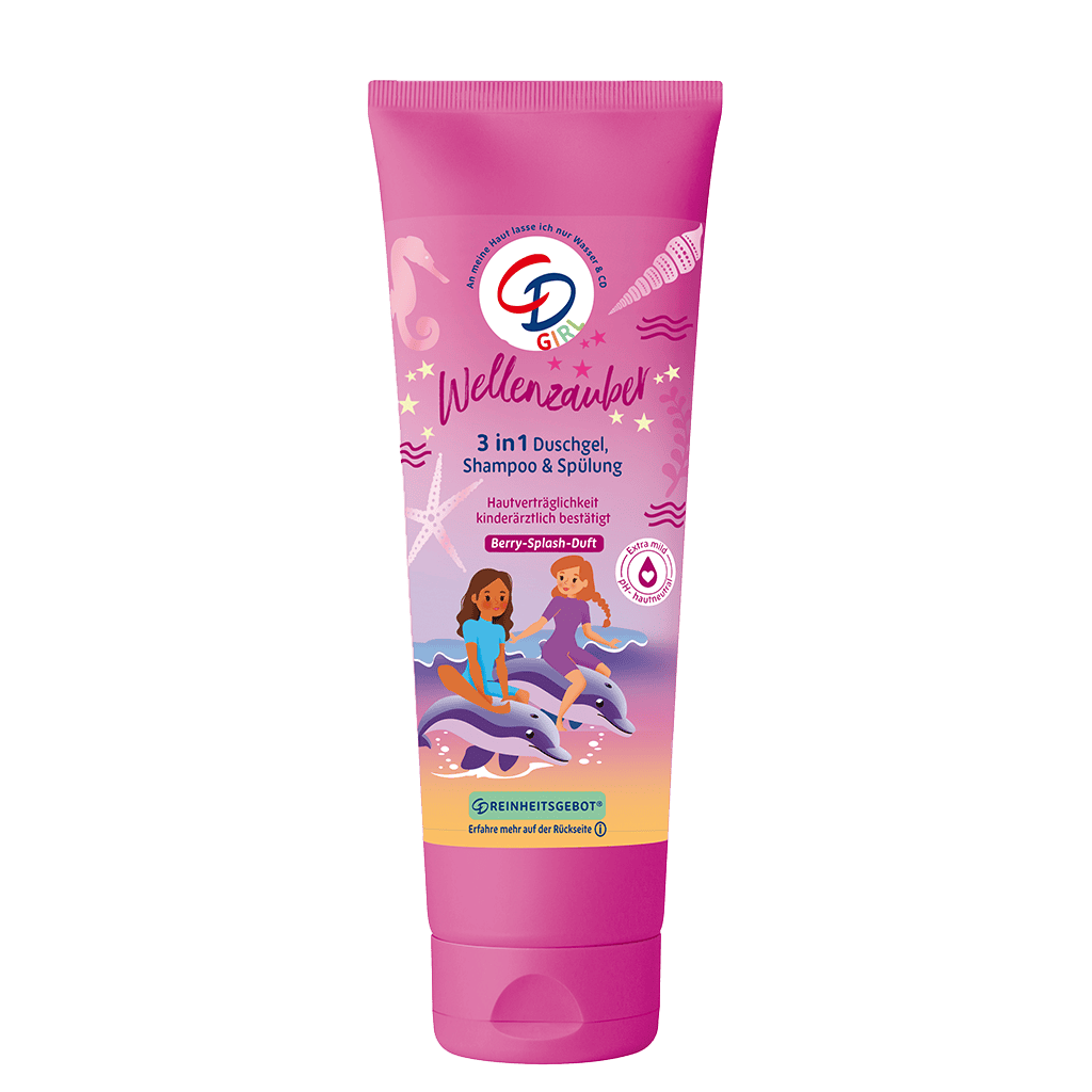 Für magische Dusch-Erlebnisse: Wellenzauber von CD Girl vereint Duschgel, Shampoo und Spülung in einem Produkt. Die sanfte Formel mit fruchtig-frischem Berry-Splash-Duft ist speziell auf die Bedürfnisse junger Haut und Haare abgestimmt.